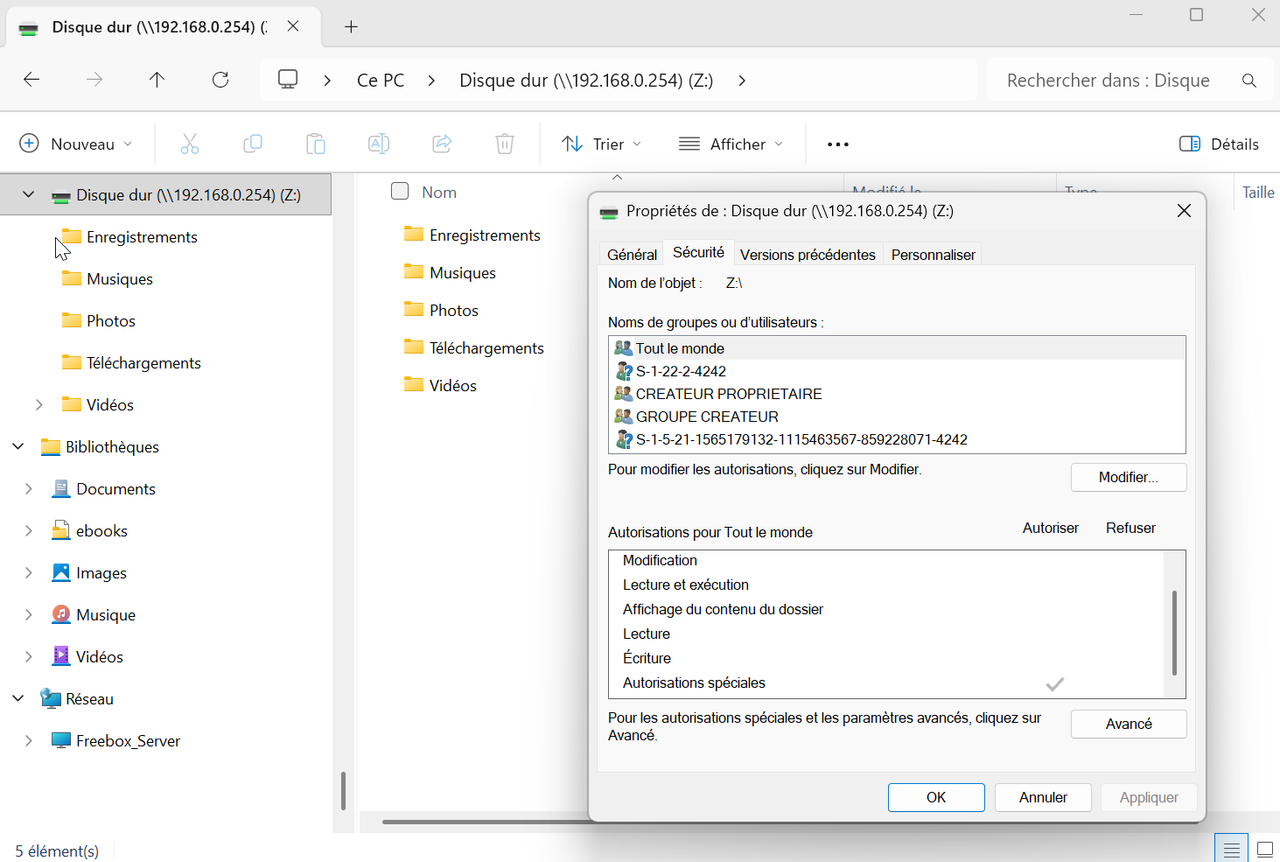 Pour ce qui est du droit d'accès, j'ai remarqué que je peux accéder au disque dur interne en passant par une connexion \\192.168.0.254 avec Windows. Seul le groupe CREATEUR PROPRIETAIRE et le groupe S-1-5-21-1565179132-1115463567-859228071-4242 ont le droit d'écriture.