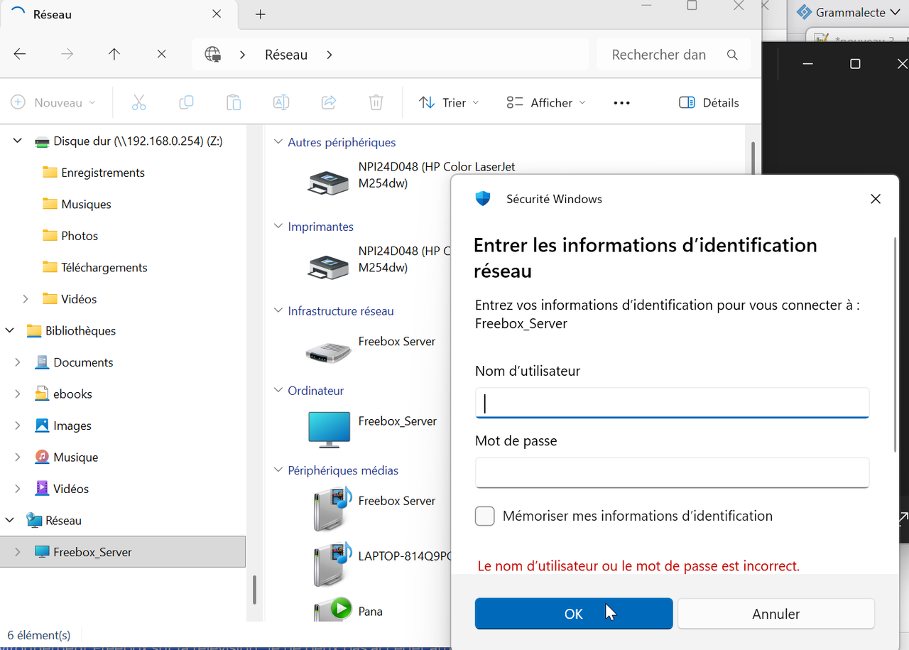 Par contre, si j'essaie de passer par Réseau/Freebox_Server, une fenêtre "Sécurité Windows" s'ouvre dans l'explorateur Windows et me demande d'entrer les informations d'identification réseau, soit un Nom d'utilisateur et un mot de passe. Je ne vois pas de quoi il s'agit. J'ai essayé le nom et le mot de passe de la connexion au serveur Freebox via le navigateur, mais cela ne marche pas.