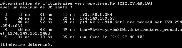 Tu fais un click droit sur le bouton démarrer puis exécuter puis tu pas cmd pour ouvrir une invite de commandes. Ensuite tu tapes tracert adresse du site, exemple tracert www.free.fr