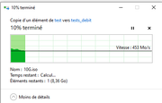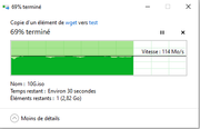 J'ai enfin reçu mon SSD, ce qui m'a permis de faire quelques tests de débit. Pour cela, j'ai pris une image iso de 10 Go récupérée sur les serveurs de débit de Bouygues Telecom, pour éviter qu'elle soit trop compressible :