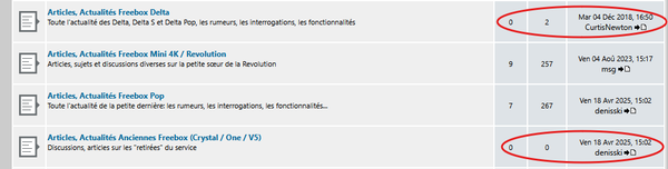 En plus je ne sait pas comment ils sont supprimer mais cela fausse toute la gestion du forum, il y a des catégories avec 0 sujet mais avec un certain nombre de messages d'indiqués et en affichage du dernier message un récent (2025), évidement quand on clic dessus il n'y a plus rien ...